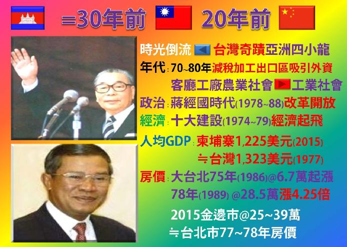 Housing prices: The average price of Greater Taipei began to skyrocket in 1975 (1986) @ 67,000, and in 1978 (1989) @ 285,000, an increase of 425%. In 1978 (1989), Taiwan's economy took off, and the stock market exceeded 10,000 points for the first time, and the average price in Taipei City @285,000. In 2015, the housing price in Phnom Penh, Cambodia was about NT$250,000~390,000, which was equivalent to the housing price in Taipei City in 1977~78 (1988~1989). A difference of 27 years.